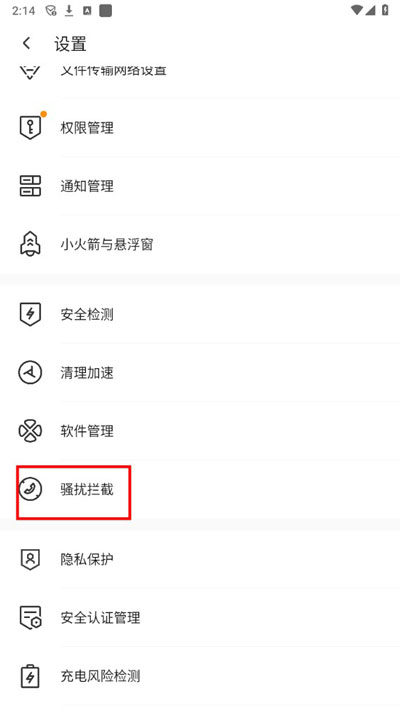选择骚扰拦截,点击右上角设置按钮,打开夜间防打扰模式进行设置即可