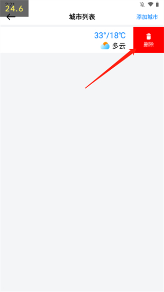 2、当我们成功点击该按钮后,我们可以左滑会发现在我们的城市中会出现一个删除的红色图标,点击该图标,然后在新弹出的窗口中点击【删除】即可成功删除城市天气。