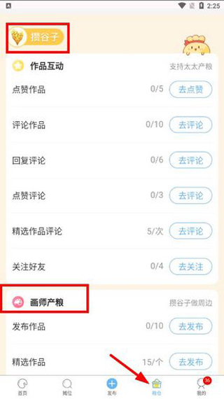 1、在【粮仓】界面可以获得几乎所有的谷子获得方法,例如普通用户可以通过点赞,评论等方式获得谷子,画师可以通过发布作品来获得谷子。