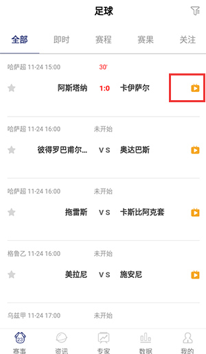2、在赛事这里,有各种赛事直播,用户只需点击赛事栏的黄色播放标志即可播放;