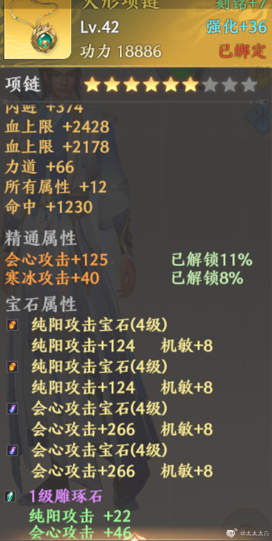 上图为武当的神器,搭配方式就略有不同,双纯阳+单命中+单会心,兼顾了属性和命中会心的提升,舍弃了减抗。这种搭配方式推荐一些号较小的平民玩家或者微氪玩家,不打架的情况下,可以暂时性舍弃掉减抗宝石,选择性价比更高的命中会心。