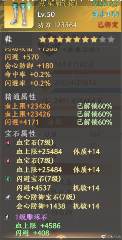 上图为双血+闪避+会防,为万金油组合,是目前大众最推荐的一种,兼顾了血量和闪避会防。
