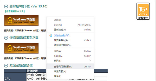 2、进到最新客户端的下载界面,现在是WeGame的,我们右键进入网页代码模式