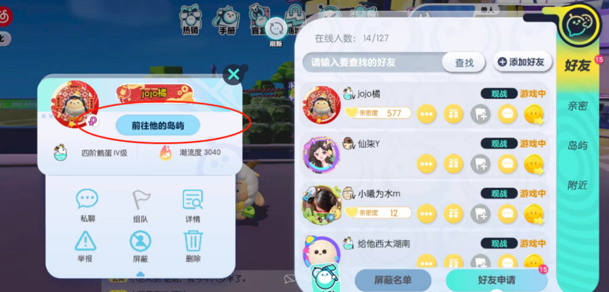 这个方法需要两个玩家,首先联系蛋搭子登入游戏,两个人登入游戏后,让你的蛋搭子打开好友列表,随后找到你,让他点击【前往他的岛屿】选项,来到你的岛屿汇合。切记传送过去后不要动哦~