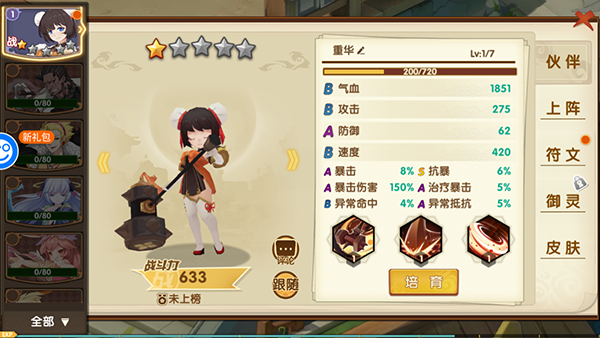 5、招募来的伙伴,可进行培养、御灵、搭配符文等方式提升阵容的整体实力