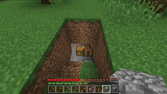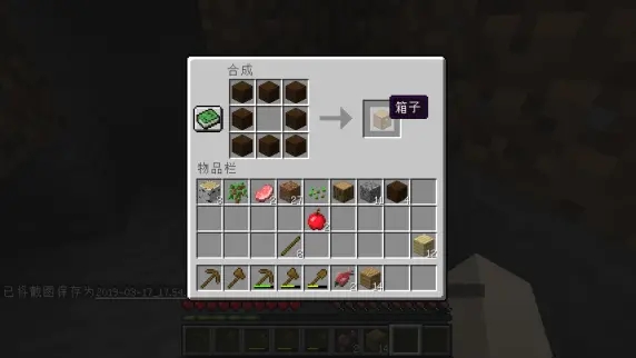八个木头,中空摆放可以让我们合成箱子,它具有九乘三共二十七格的存放容量。我们可以把我们用不到的,或者怕死亡丢失的物品储存在里面。