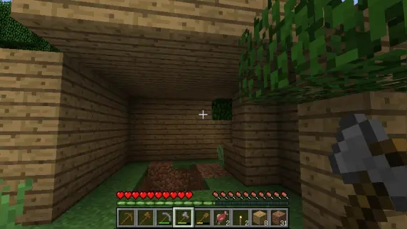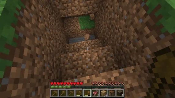值得注意的是,挖掘矿洞的时候最好挖掘出阶梯,这样方便我们以后来回。如图所示,我们已经可以看到石头了,让我们使用木镐来开采一些石头吧!