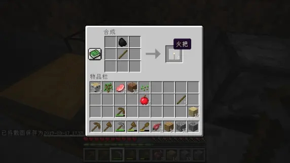 然后让我们将煤与木棍放在一起合成四个火把。火把可以为我们提供光源,如果亮度不够,那么就会产生可怕的怪物来袭击我们,所以我们在探矿的时候要记住随时备有木棍与煤,在矿道中一边开采一边插下火把来保证自己安全。