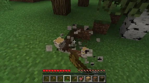 我们只需要将准星对准我们要开采的木头,按住鼠标/屏幕,方块会碎裂,等到它完全碎裂之后,就可以获得开采下来的方块了。所以我们在一阵殴打之后可以获得一块原木。