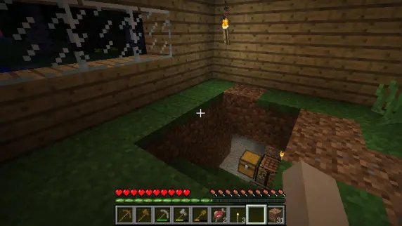 现在,我们在刚刚修好的小矿洞里面插下几个火把,然后返回地面。