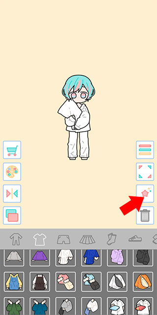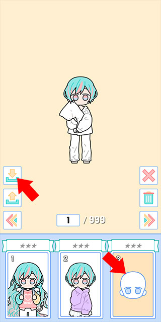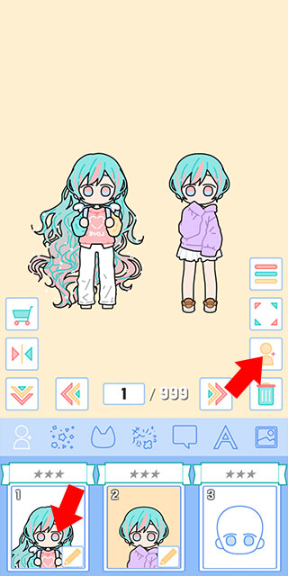 4、然后我们来到下方界面,然后点击我们之前保存的搭配即可将小人放到屏幕上,长按可拖动角色,往下滑至垃圾桶按钮可删除角色,返回搭配界面的话同样是点击右方第三个按钮。