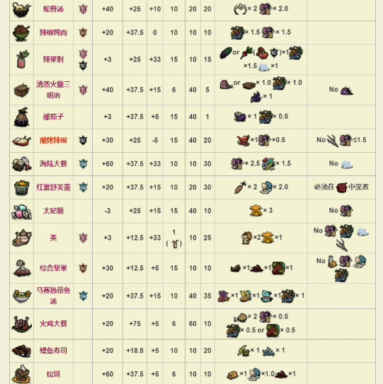 从第一幅图中,我们可以看到回血最高的分别是曼德拉草汤和火龙果派以及华夫饼。但是曼德拉草汤虽然回血回的多,原料却是太少了。一个地图上能有三个曼德拉草就已经不错了。所以火龙果派是当之无愧的第一,成本低廉,并且吃的时候不会有停顿动作。