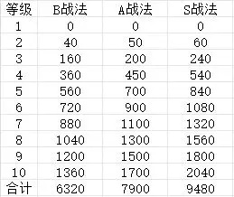 在游戏中,B、A、S战法分别需要如下对应的战法点,来升级。1级为初始等级,无需升级。