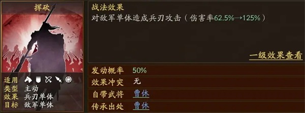 对于0氪低氪的朋友来说,初入游戏是比较难获得战法的,建议直接B战法走起过渡。这里建议2个B级战法用来补充输出,挥砍给兵刃武将使用,火攻给谋士武将使用。