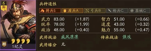 纪灵的S骑兵适性、A盾兵适性可以作为阵容的补位武将。但更建议的是传承出战法“强攻”。