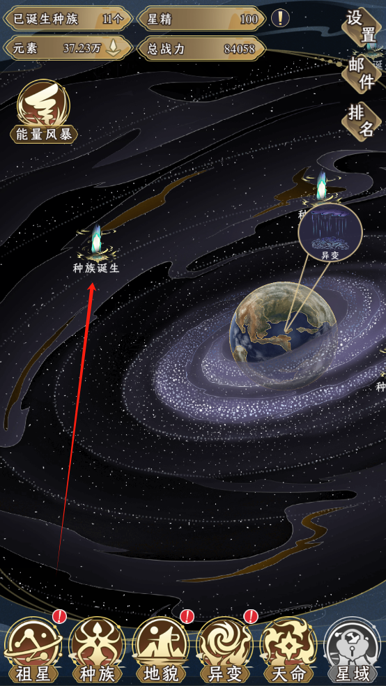 1、下载祖星发展模拟官方版进入游戏,点击“种族诞生”发展祖星提升战力,种族越多,祖星战力越高;