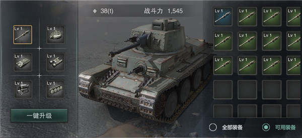 4、然后去坦克装配车间界面,各种一键升级,保证坦克等级等于角色等级。