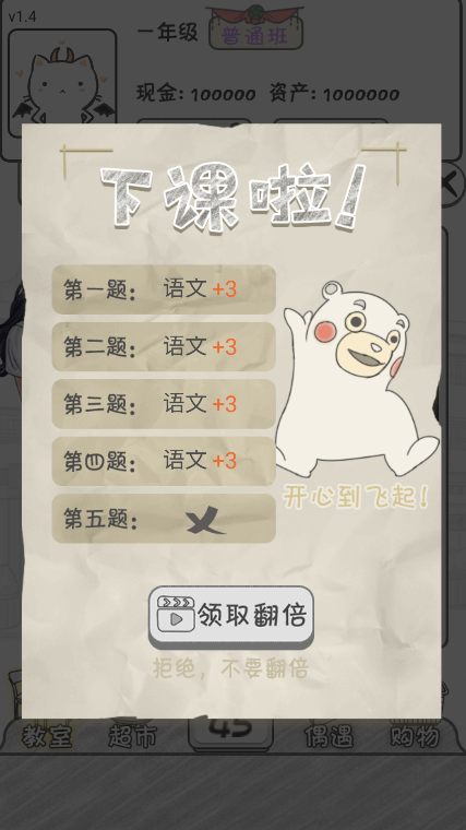 5、玩家不断的答题学习,直到是语文、数学、英语课程得分在60分以上,并且将日历的天数点为0的时候就可以升级了。相当于现实学期结束了,并且期末考试及格了,是不是很有趣呢!