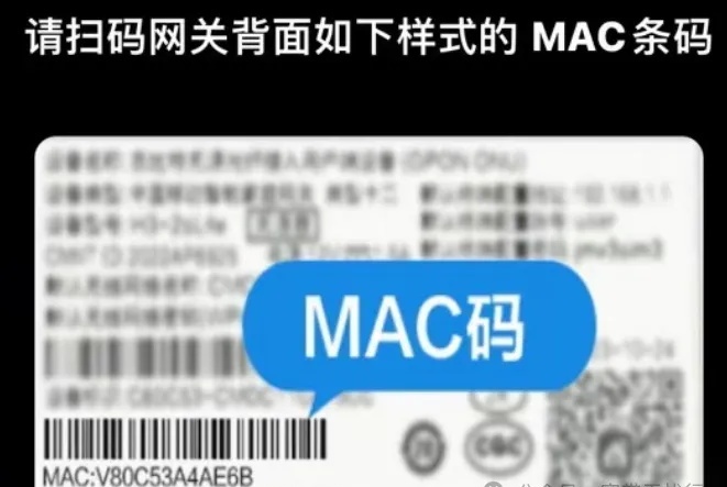 - 绑定智能网关(光猫),可直接选择“扫码绑定”,扫描光猫背面的MAC条形码即可。