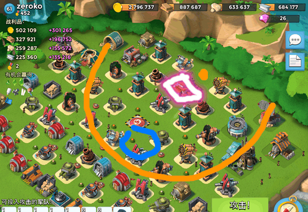 2、虽然这个流派很厉害,但是他也不是那么很容易上手的,需要平常多加练习,手速要跟得上野人的速度,能在合理的时间释放出合理的战舰技能,来掩护野人进攻才行的,这样才能将野人的损失降到最低(野人可是单刀直入司令部的,各种防御建筑肯定是围绕着司令部来防御的,所以他们承受的攻击压力也很大,稍有不慎就会全军覆没,白忙活一场)。所以,能玩得好这个流派的,基本上都是大神,玩起其他流派没有什么大问题,比前面两个流派厉害不少。
