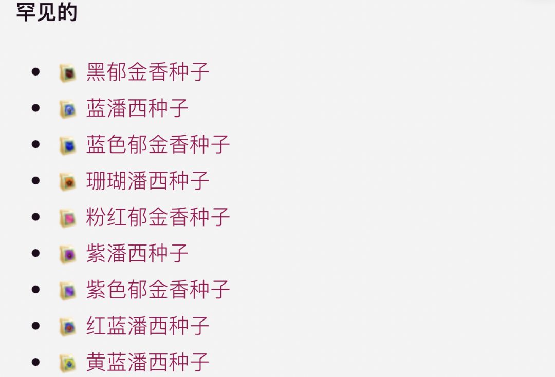 其他时间可种植普通花朵,普通花的种子在花园里的陶俑人可以买。集齐对应的数量和种类种也可以在陶俑人那里兑换花朵家具。普通花成长周期为3小时。