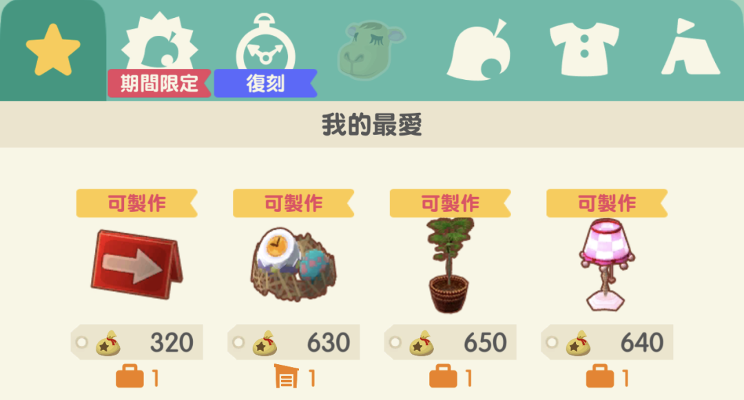 插一个小技巧,村民15级制作的特殊家具,如果材料缺少,无法及时都制作完,可以将还没制作的家具,登陆“我的最爱”,更方便以后制作。如果有制作一分钟航海材料的家具(后面会提到)也可以登录到"我的最爱"中,方便随时制作。