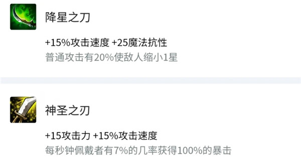 【降星之刀】(+15%攻速+25魔抗):携带者的普攻有20%的几率使敌人缩小1星,这个也是枪手阵容的神装之一了。