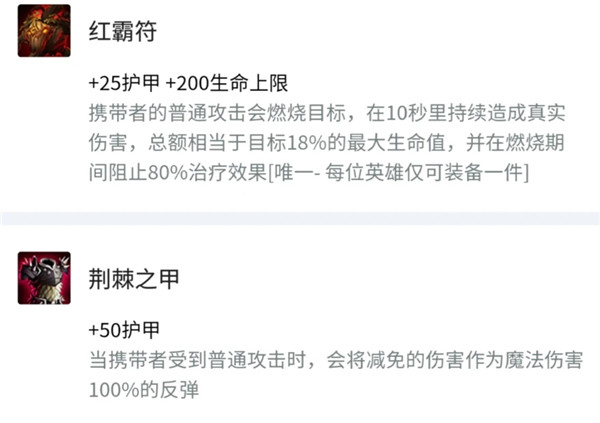 【红霸符】(+25护甲+200生命值):携带者的普攻会燃烧目标,并在10秒内造成真实伤害,而最重要的是在燃烧期间,会阻止目标80的治疗效果,这个效果有点类似于S5.5版本中女枪的技能,而红霸符也是枪手阵容最关键的装备之一了。