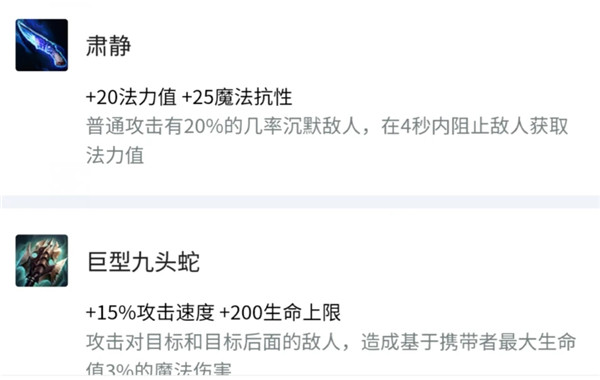 【肃静】(+20法力值+25魔抗):普攻有20%几率沉默敌人,并在4秒之内阻止敌人获取法力值,这件就是网友们口中的沉默刀了,而这件也是枪手阵容的关键装备之一。