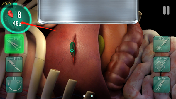 6、手术是有时间限制的,在左上角的显示的时间内完成得分会更高。如果时间到了还没完成则手术失败。