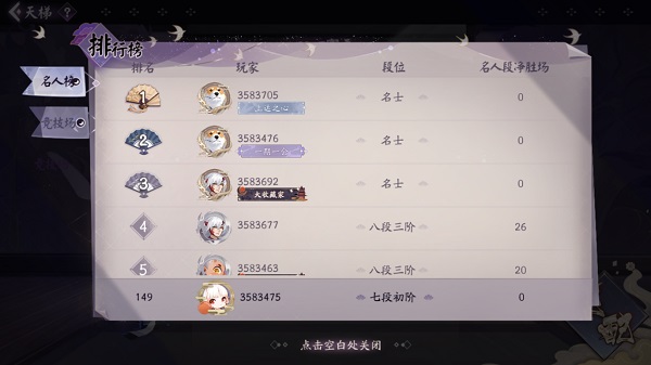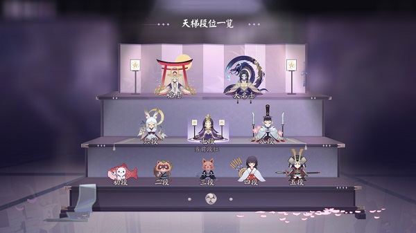 在“天梯”中,客人们将匹配到实力相近的对手进行对局,对局开始前,客人需选择4个出战牌不小于8张的出战式神。赢得比赛会获得“鬼火”(这里的鬼火并不是对战中行动消耗的鬼火,而是提升段位用的)、金币、秘卷、头像和达摩铜币等奖励。
