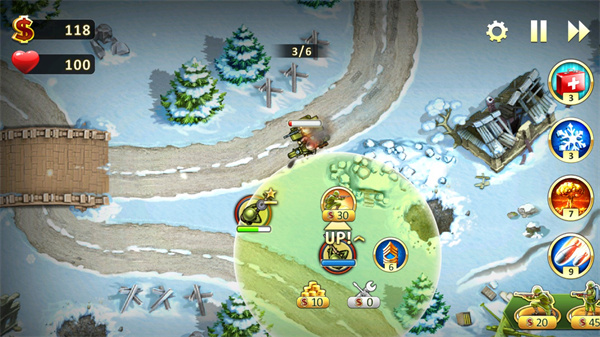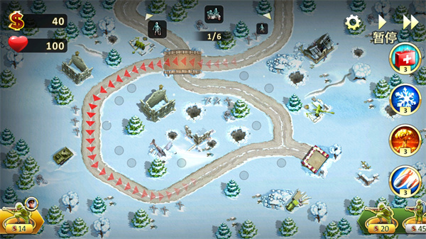 在攻略方面,推荐优先升级大兵,毕竟性价比高,适合新手。喷火兵对付装甲车很厉害,坦克则专门打装甲单位,防空塔用来对抗空军。摆放位置也很重要,前方放大兵磨血,后方放坦克,远处放防空塔。