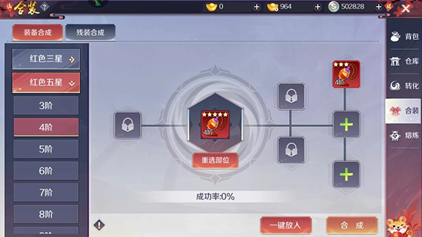 当玩家合成三阶到六阶五星红装的时候,只需要准备对应的三星红色装备即可。每次合成都只需要消耗三件装备,而合成的成功率也是百分百可以成功的,在这个阶段是玩家战力提升最快的一个阶段,玩家只需要通过BOSS的挑战就可以获得合成所需的装备。技巧就是一定要三件合成,一定不要和系统去拼几率。