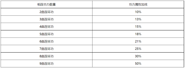 当相连阶数的功力属性一致时,就会构成连环功,大大提高功力加成属性。连环功连环数量越多,加成越高。