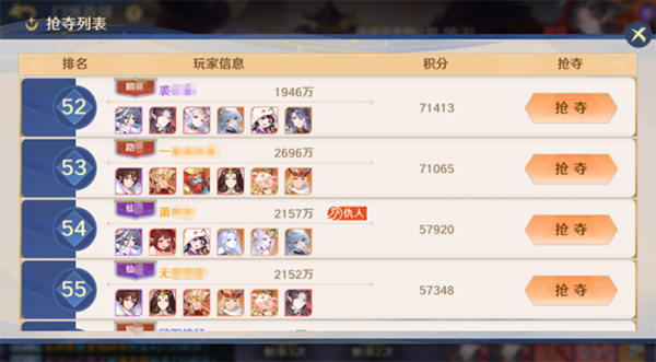 ③抢夺:选择高积分并且你能打过的人薅(不用着急打完次数,坚持“螳螂捕蝉,黄雀在后”原则);如果第一名公会已经远超你们,建议针对其他分值相近的门派,保证自己门派的排名靠前获得更多奖励。