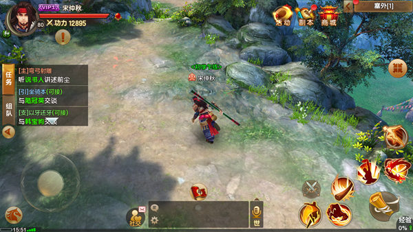 主界面布局如截图所示,主要包括头像显示、任务追踪、聊天框、活动功能入口、虚拟摇杆、技能操作区几个部分。