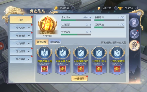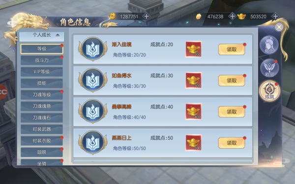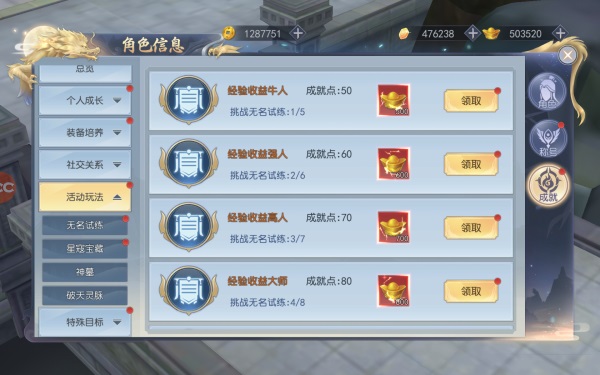 在游戏主界面点击左上角的人物头像,进入“个人中心”后点击“成就”即可进入成就系统。有“个人成长”“活动玩法”“总览”三大类别,达成每一个成就后点击“领取”键就可获得对应元宝奖励哦~