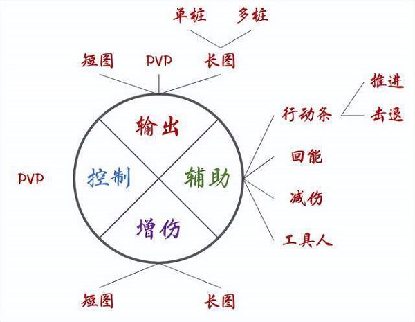 其中维一针对四大部分进行了一些细枝末节的衍生,这里稍作解释:输出部分可以细分为短图、PVP和长图,而长图又可以分为单桩敌人和多桩敌人两种辅助部分可以细分为行动条、回能、减伤和工具人四个分支,而行动条又能再次细分为推进行动条和击退行动条两种增伤部分可以细分为短图增伤和长图增伤两部分最后的控制部分则主要是集中于PVP类战斗在了解了更加细致的分类之后,我们便能将不同的魂师融入其中,接着维一便会给大家分别呈现以上四大部分的魂师标签汇总,当然也会依次做一些小小的补充说明: