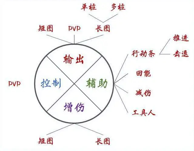 首先我们需要明确,目前游戏中基本上所有的魂师,他们的基础功能大致就可以分为四大部分,其分别是输出、辅助、增伤和控制,所以接着我们的细分部分也会按照这四大部分进行慢慢的衍生,然后便能得到这幅图片: