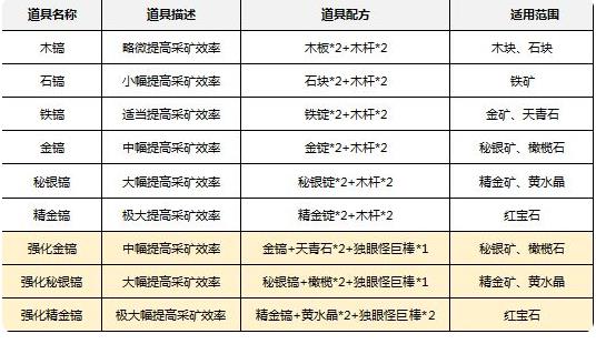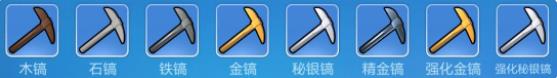 1、从木镐开始,其道具品质由上至下逐渐提升。其中,品质高的均可以挖掘品质低一级的镐所适用的矿物;