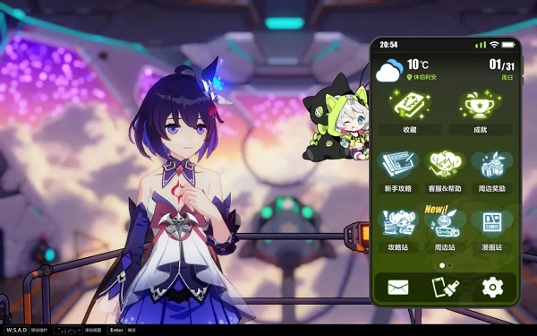 后崩坏书的主页面,萌新推荐这张地图的原因是试用独立的剧情角色,可以解决萌新初期自己阵容较弱的问题(樱色和天命需要使用自己的角色)。另外奖励比较丰厚,下排黄色地球选项通往地图选择页面。