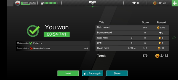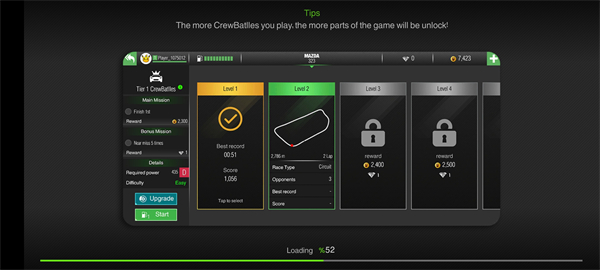 5、每完成一个任务都可以获得大量的金币,同时还可以看到自己的赛车时间;