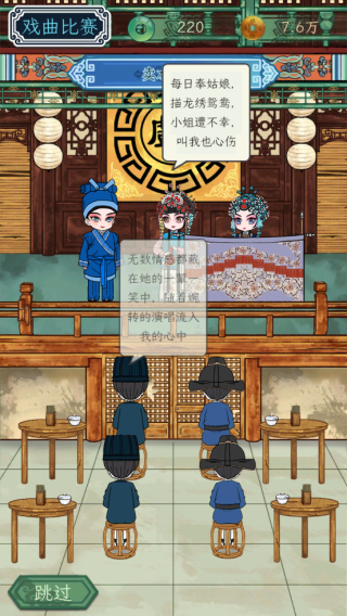 继承了一座戏园子是一款题材新颖的模拟经营类小游戏,将戏曲、经营、种田三种元素巧妙融合,游戏画面采用的是Q版卡通风,但依旧可以感受到浓浓的古朴传统气息,游戏的操作很简单,只要点击选择就能进行,很合适用来放松休闲养老。游戏中加入了大量的剧情文字,让大家感受到戏曲诞生的背景,以及戏曲给我们带来的快乐。