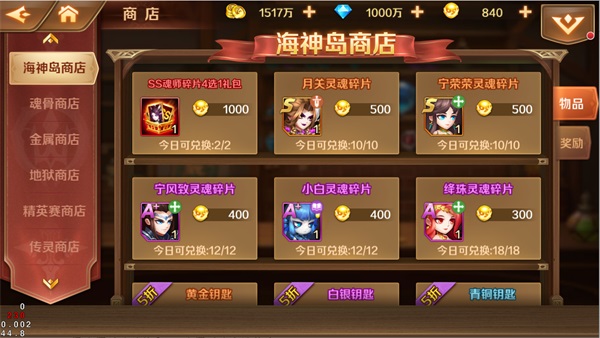 在海神岛历练中可以获得海神币,海神币可以在海神岛商店内兑换珍惜道具,其中就包括了大量S级魂师灵魂碎片和SS魂师灵魂自选礼盒!是不是十分诱人呢~