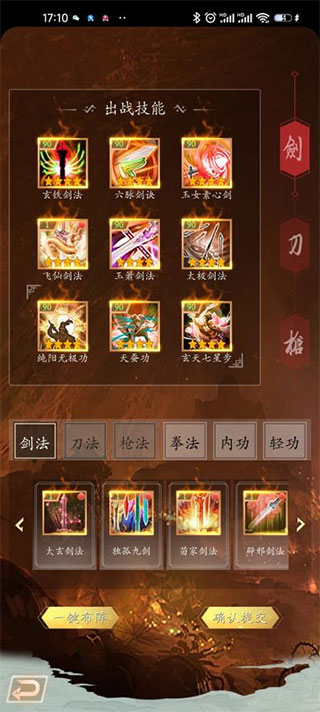 玩家需要设置3组技能:剑法组、刀法组、枪法组。
