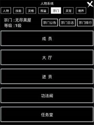 人物面板里面包含人物属性、技能、灵根、图鉴、宗门、宠物、境界共7个部分。