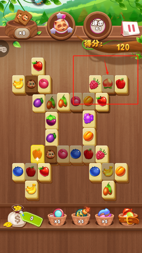 3、被挤在中间的水果是不能消除的,需要把旁边的水果消除掉先;