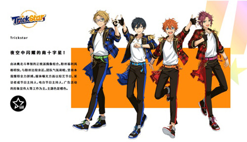 Trickstar由衣更真绪、游木真、明星昴流、冰鹰北斗四位美少年组成,他们性格各异,但是都在舞台上散发着别具一格的魅力!就让这四位美少年和你一起享受音乐演艺的生活吧!