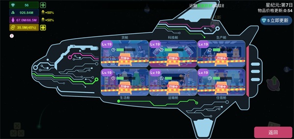 其次的话注意主舰一定要升级,别因为运输不够就只升货仓和运输仓(其实后面我的运输基本上都是空出来,原因上面提到过,我不屯那些货,所以不用再各个星系来回运输,基本只要运输市场的就行)。我觉得生产仓和科技仓是最重要的!生产仓决定了你在市场能不能做那些来钱快的商品,科技仓不够你任务不好做,材料也不好来。像我刚开始不升生活仓与住宿仓导致等级不够,后来花了好多钻石才跟上进度(为了满足我的强迫症)。
