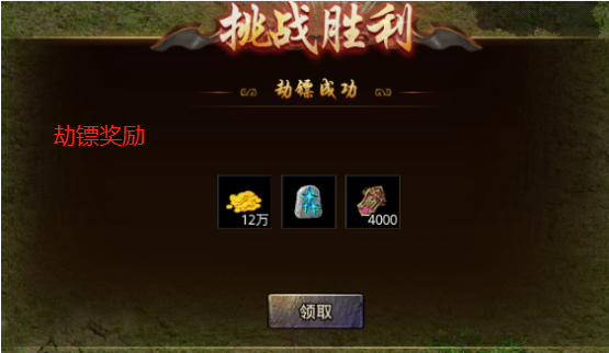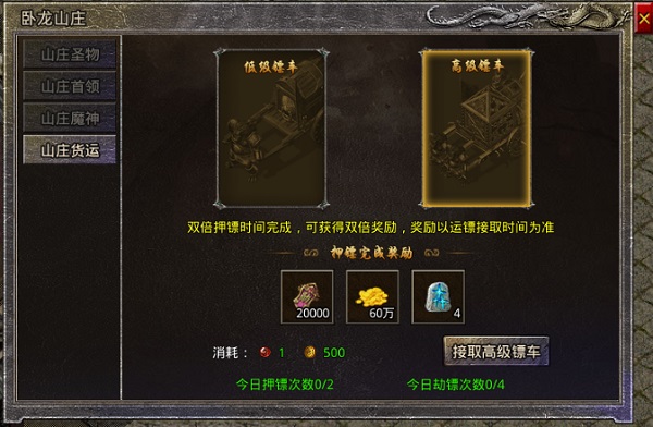 高级镖车押运需要消耗500传奇币和1个卧龙镖令,押运完成奖励(单倍):20000功勋、60万金币、4个生命之息。